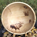This hand-crafted wooden bowl features a meticulously rendered pyrography (wood-burning) scene depicting a majestic bull moose traversing a natural landscape in the Alaskan wilderness.