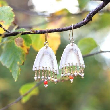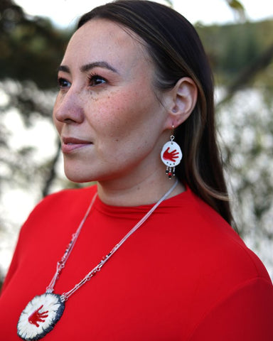 Natural Polished Moose Antler with Hand Carved Hand Imprint Inlay with Red Epoxy Earrings - Ruby Red Keyocera Opals; Onyx; Sterling Silver Beads, w...